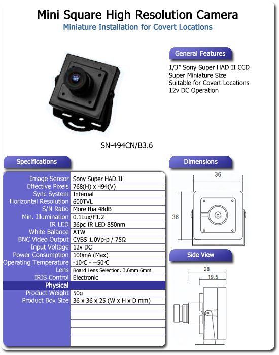 Home > Surveillance > CCD Cameras > CCD Mini > SN-494CD/B3.6